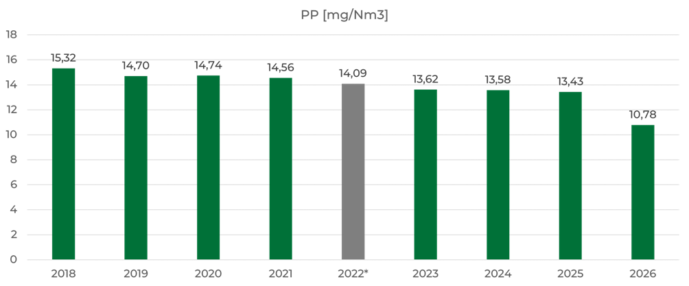 Grafico 1 – Andamento delle emissioni medie di particolato primario del parco (*2022 non disponibile ottenuto per interpolazione)