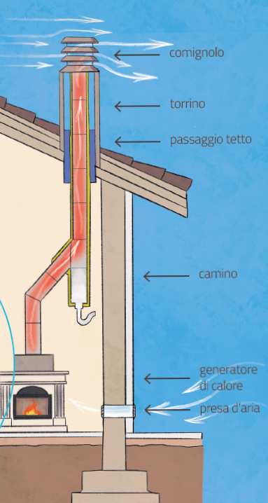 Un impianto di riscaldamento a legna o pellet non è fatto solo dal generatore di calore ma è composto anche dallo scarico dei fumi oltre il tetto e dalle prese d’aria.