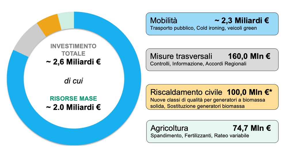 Il totale degli investimenti previsti dal Piano d’Azione per il miglioramento della qualità dell’aria (PAA 2025-2027) ammonta a circa 2,6 miliardi di euro, di cui oltre il 76% proviene da risorse del Ministero dell’Ambiente e della Sicurezza Energetica (MASE).
