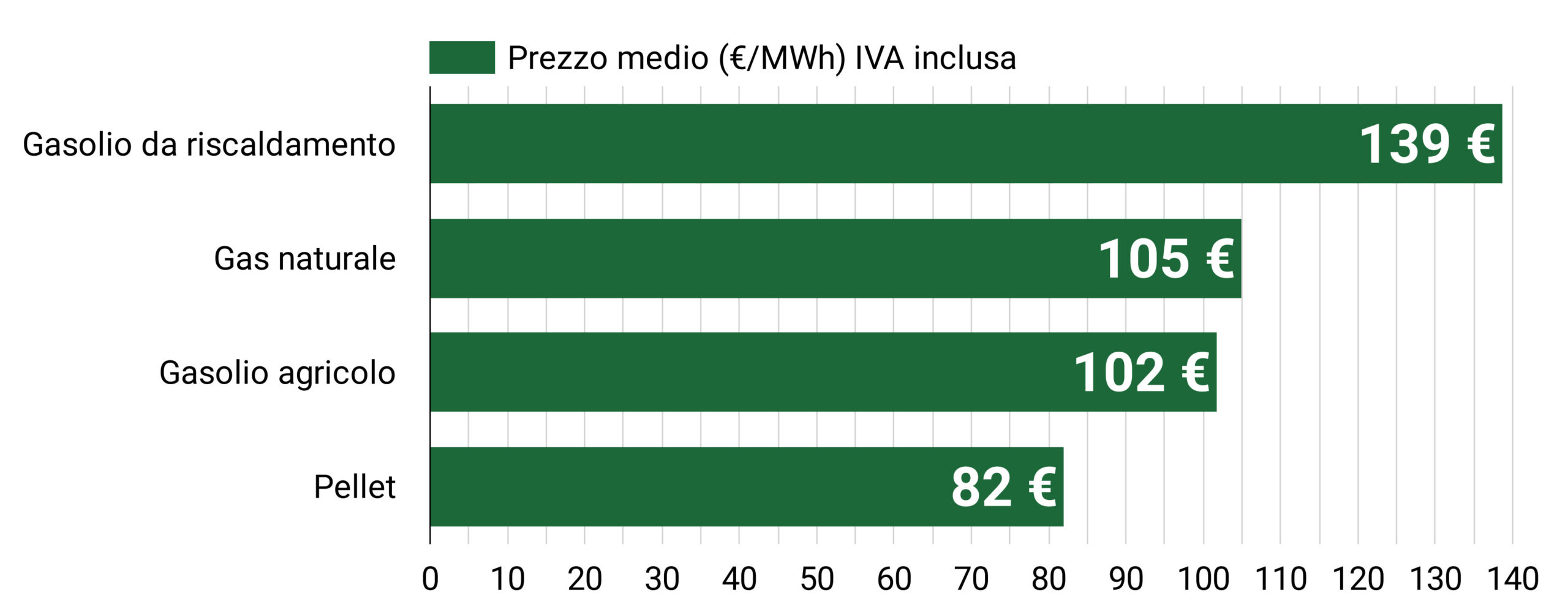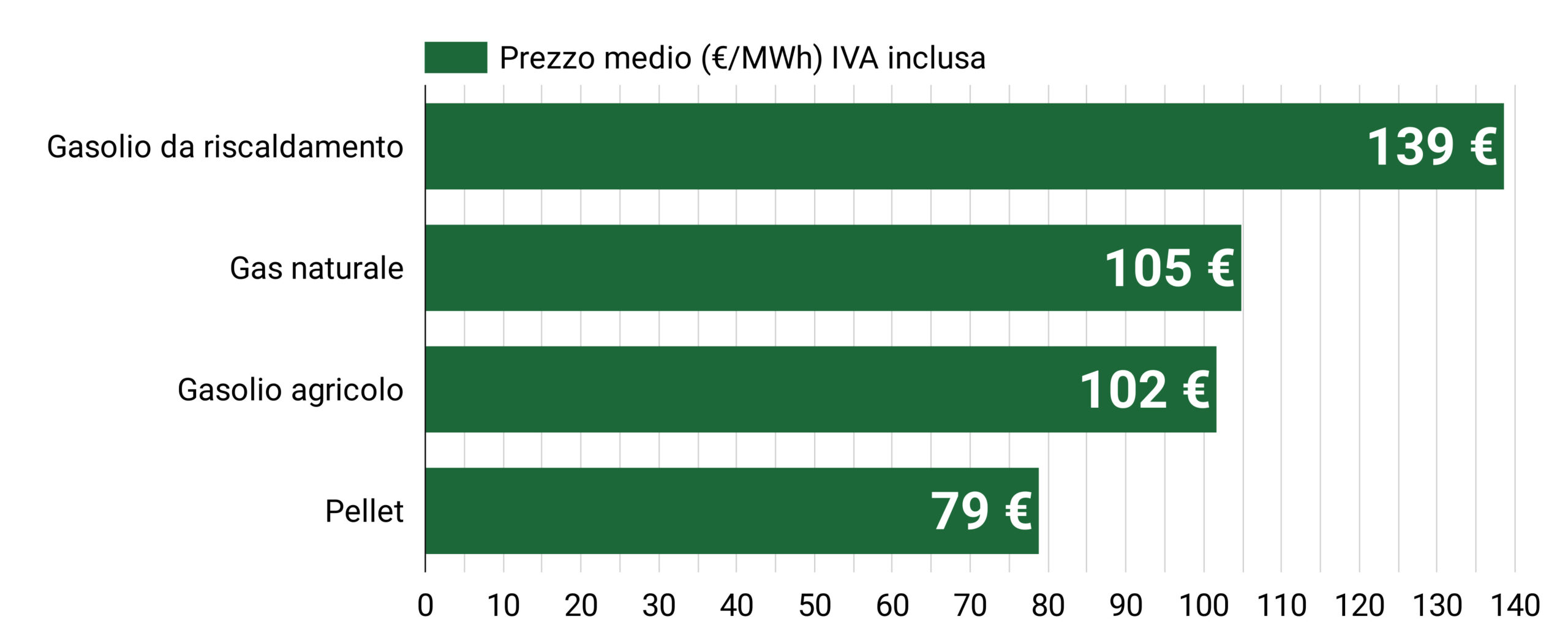 Produrre 1 MWh di energia utilizzando pellet in classe ENplus® A1 richiede la combustione di circa 208 kg di materiale, equivalenti a circa 14 sacchi da 15 kg. Il costo stimato per questa quantità di energia è di circa 79 €/MWh, un valore decisamente competitivo se confrontato con altre fonti energetiche tradizionali. Il pellet è più conveniente rispetto all’uso sia del gas naturale, che costa 105 €/MWh (il 25% in più), sia del gasolio da riscaldamento che costa ben 139€/MWh (il 43% in più): vedi grafico 1.