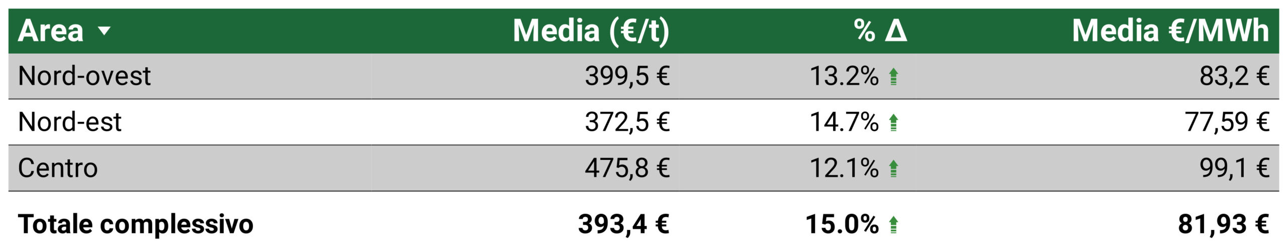 Il pellet venduto con consegna in autobotte fa registrare un prezzo medio nazionale di 82 €/MWh, segnando un aumento del 9% rispetto ai valori rilevati nello stesso periodo del 2024. Questo rialzo riflette dinamiche di mercato specifiche legate alla modalità di distribuzione e alle esigenze logistiche, che incidono sul prezzo finale offerto ai consumatori.