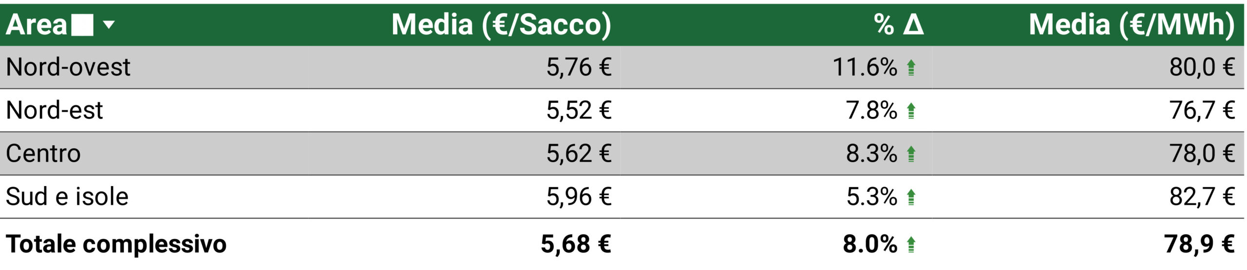 La Tabella 1 riporta i valori registrati nelle diverse aree geografiche. A Nord-Ovest il prezzo del pellet passa da 5,1 € a 5,7 € per sacco, registrando un aumento di circa il 11% rispetto al periodo precedente. Anche per il Nord-Est si registra un lieve aumento del 7%, passando da 5,0 a 5,5 €/sacco. Nell’area del Centro si osserva un trend in aumento passando da un valore di 5,2 €/sacco ad un valore rilevato ad oggi di 5,6 €/sacco.