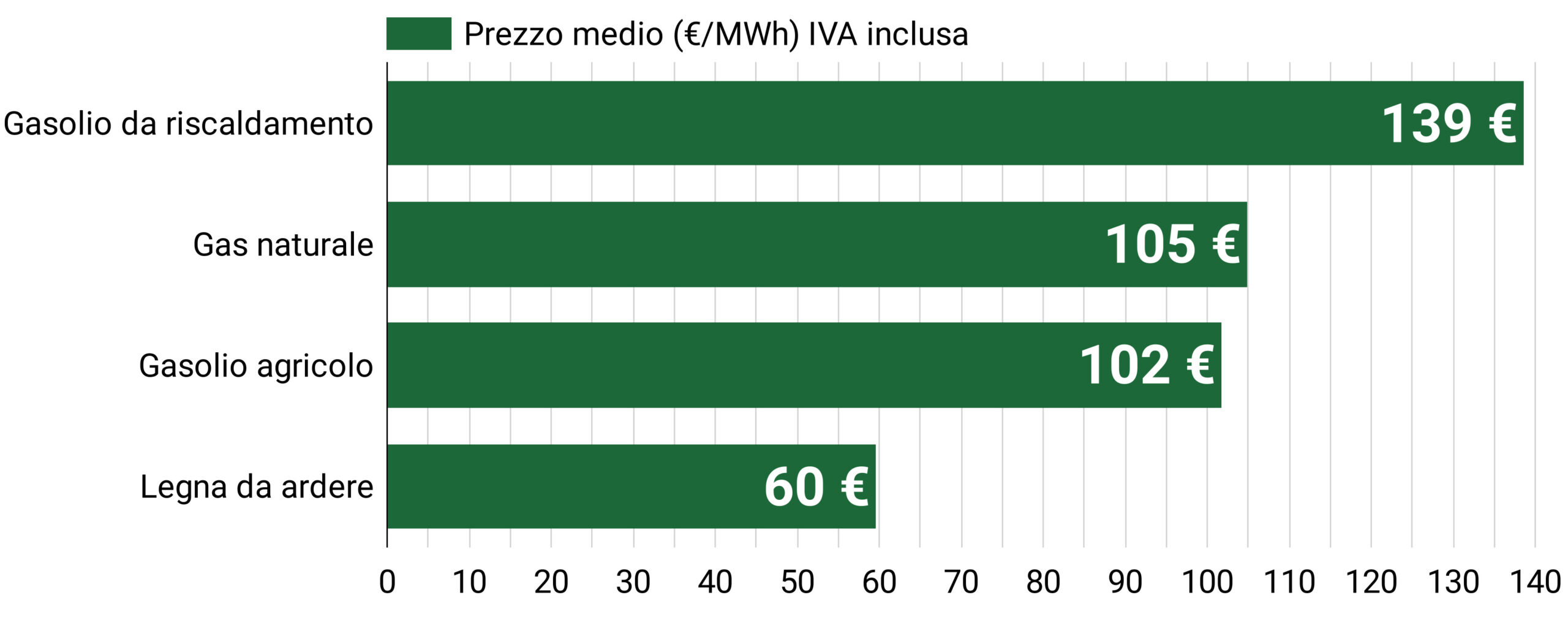 Passando ad un esempio concreto, si consideri un appartamento con caratteristiche medie in Italia che necessita di circa 10 MWh di energia per il riscaldamento annuale. Il costo stimato per riscaldarlo con legna da ardere è di circa 570 €, assicurando un risparmio del 46% rispetto al gas naturale, il cui costo si attesta intorno a 1060 €, e del 58% rispetto al gasolio, che supera i 1350 €. Per quanto riguarda il GPL, pur presentando generalmente un costo superiore in €/MWh rispetto al gasolio, il suo prezzo mostra una forte variabilità a livello territoriale, rendendo difficile un confronto uniforme