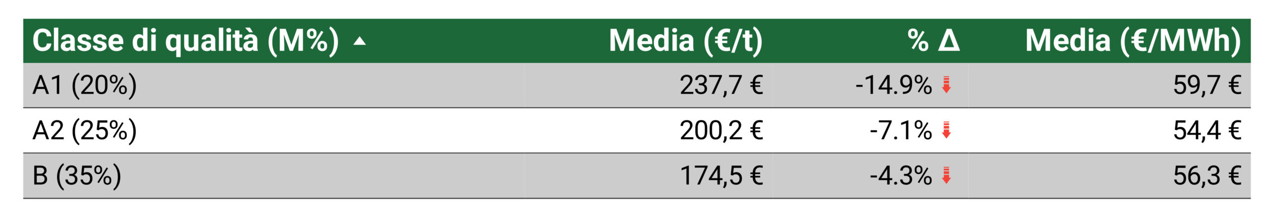 Andando ad analizzare i valori riportati nella tabella 1 vediamo che per l’acquisto di legna in Classe A1, ha visto una riduzione di prezzo del -14% rispetto al 2024, pari a un calo di circa -4% rispetto a quanto rilevato ad aprile 2025. Nella classe A2, che risulta la classe intermedia, vediamo come il prezzo (200 €/ton) sia sceso del -7% rispetto al valore che era stato rilevato lo scorso anno e che risulta essere stabile invece con il prezzo che era stato indicato nella rilevazione di aprile 2025. Sebbene il calo sia meno marcato rispetto alla Classe A1, si nota comunque un trend di discesa che potrebbe indicare una normalizzazione dei prezzi o una minore competitività rispetto ad altri materiali energetici.