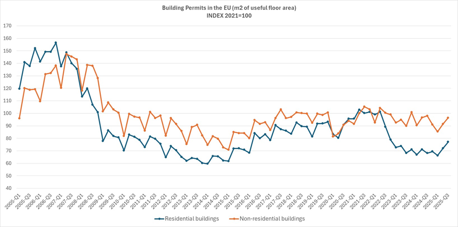 I permessi di costruire, indicatore fondamentale per capire dove va il mercato immobiliare, sono calati praticamente del 30% a livello europeo rispetto al 2021 nel settore immobiliare, nettamente il settore più importante per la domanda di segato in Europa. Quest’indicatore è sufficiente per spiegare i motivi delle attuali difficoltà delle segherie. La linea blu del grafico 1 sottostante mostra che i permessi di costruire negli ultimi due/tre anni a livello europeo sono ai livelli più bassi praticamente negli ultimi 20 anni. Possiamo osservare un timido miglioramento alla fine del 2025 e vedremo se questo miglioramento verrà confermato nei prossimi mesi.